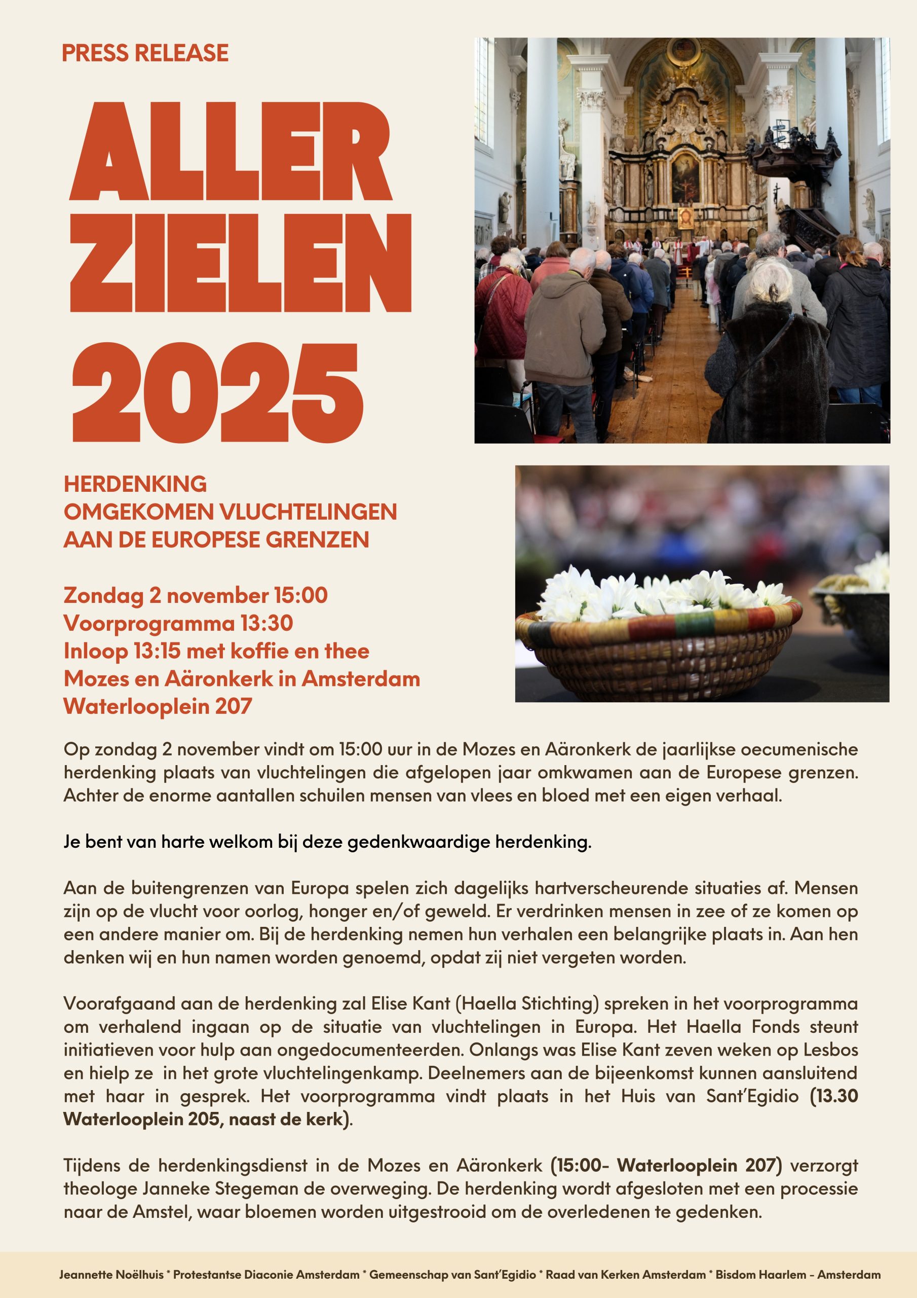 | In de Mozes en Aäronkerk, Waterlooplein 207, vindt op 2 november de jaarlijkse oecumenische herdenking plaats van vluchtelingen die afgelopen jaar omkwamen aan de Europese grenzen. Vertegenwoordigers van verschillende kerken zijn daarbij aanwezig. |